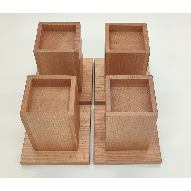 Un cube de bois, avec un évidement dans la partie supérieure et une base en bois supplémentaire pour une plus grande stabilité. Conçu spécialement pour les lits