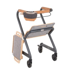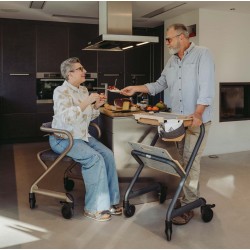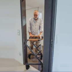 Ce déambulateur d'intérieur haut de gamme, entièrement équipé, passe presque toutes les portes grâce à sa largeur de seulement 51 cm à son point le plus étroit. Doté d'une large gamme d'accessoires, il constitue une aide polyvalente au quotidien. Il supporte tout le poids du corps sans basculer. Il comprend un siège, adapté et testé pour une utilisation même pour les déplacements à petits pas assis. Il sert non seulement de chariot de service, mais aussi de surface de rangement, de siège confortable et rembourré, de panier à linge et de support pour les toilettes.